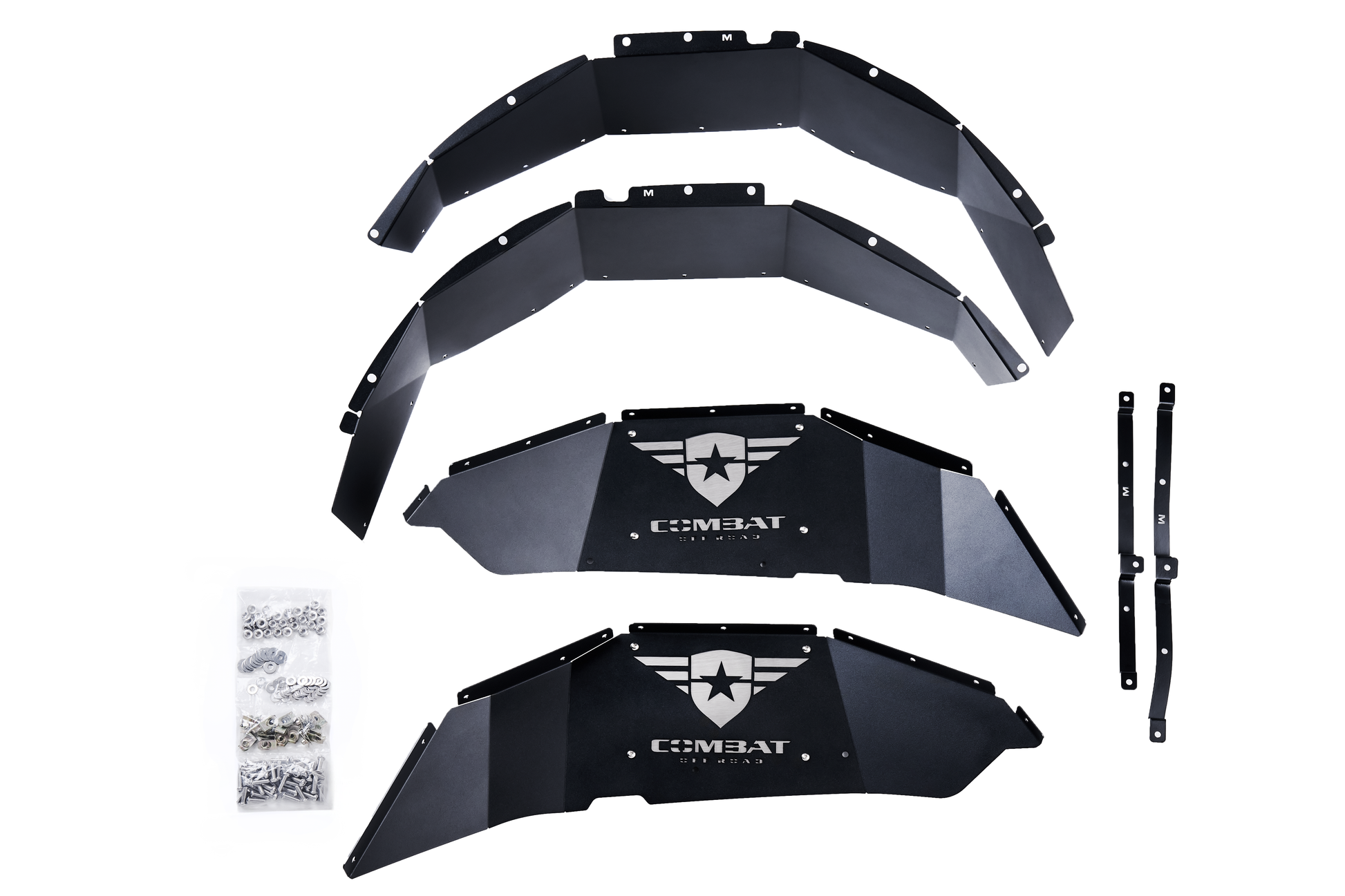 Upgrade your 2018+ Jeep Wrangler JL/JLU with the Combat Off Road Battle Ready Aluminum Inner Fender Kit. Designed to protect your engine bay from debris while enhancing airflow, these inner fenders are constructed from laser-cut 6063 aluminum and finished with a high UV load black powder coat for durability. The mesh inserts promote optimal ventilation, and the removable backing plate allows for personalized customization. Installation is straightforward with the included stainless steel hardware. As with all Combat Off Road products, this kit is backed by our Combat Lifetime Guarantee.