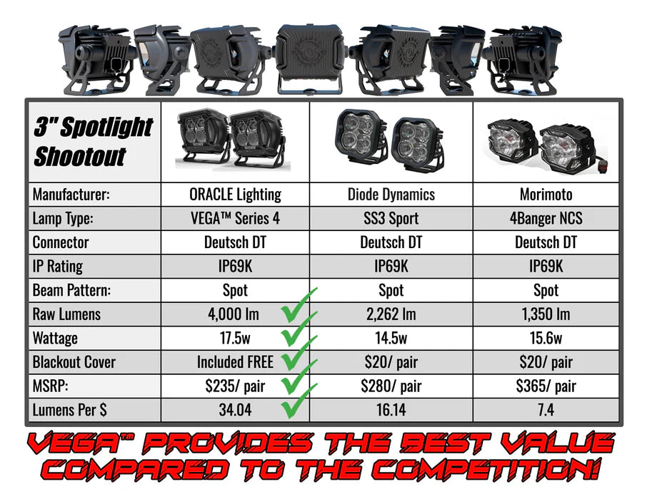 Our Goal: The objective of the Vega compact off-road LED series is to provide users with an unparalleled lighting experience. Utilizing high-quality LED lighting components, such as OSRAM LED chips, the Vega series offers intense output performance while also providing a high level of overall durability and performance. We are happy to provide MORE light output at a price point that is LOWER than many comparable products on the market.